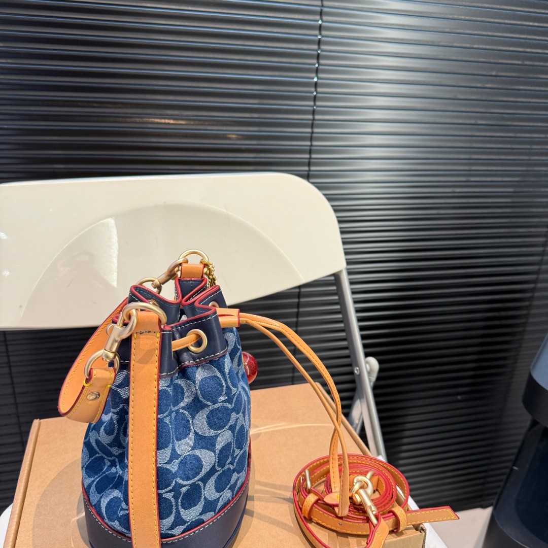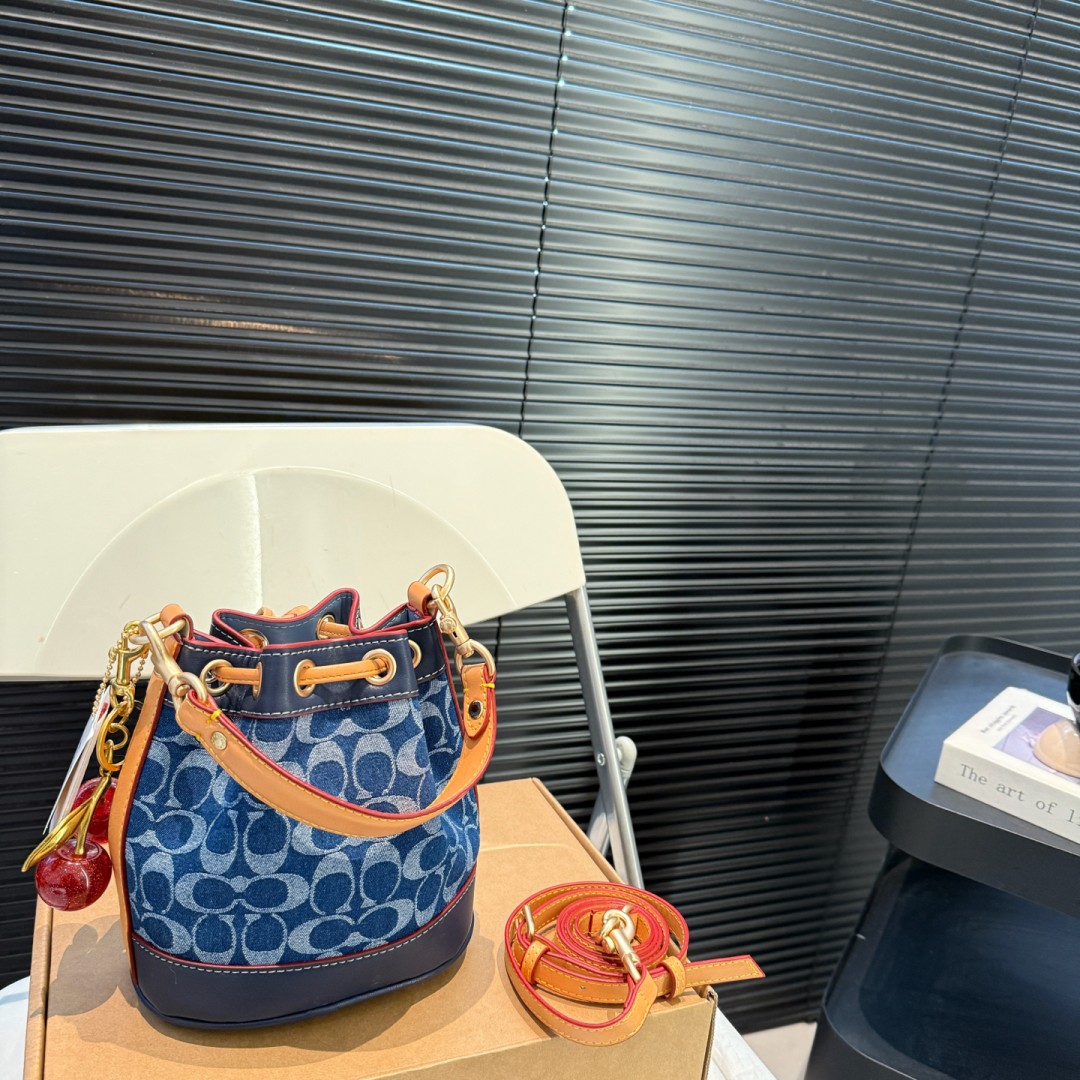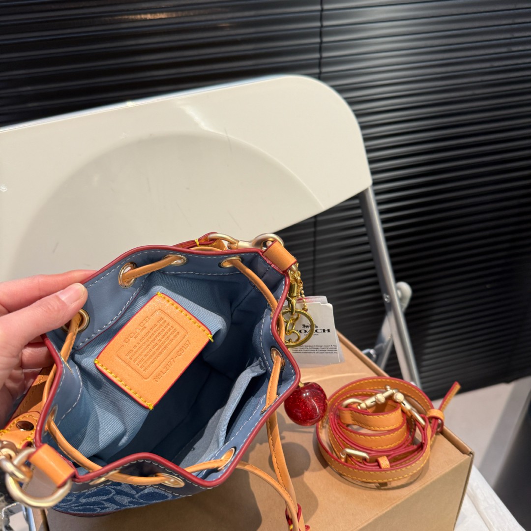 COACHのデニムバケットバッグが登場。爽やかなブルーとホワイトのブランドロゴが特徴的なデザインです。オレンジレザーのドローストリングとストラップがポップなアクセントに。楕円形のレザーベースとコーナープロテクターが耐久性を高めています。可愛いチェリーのチャームが遊び心をプラス。手提げ、ショルダー、クロスボディの3WAYで使える便利なアイテムです。