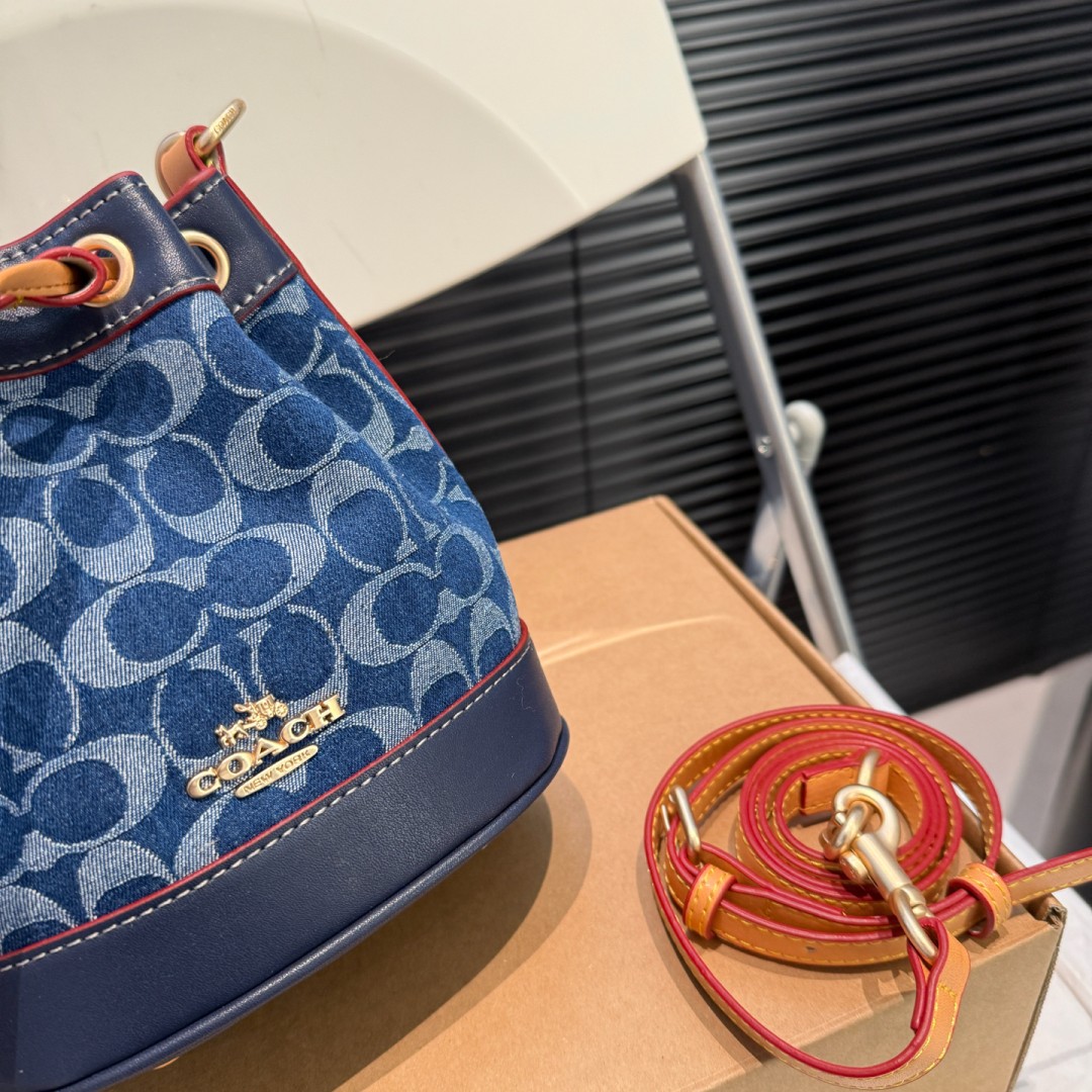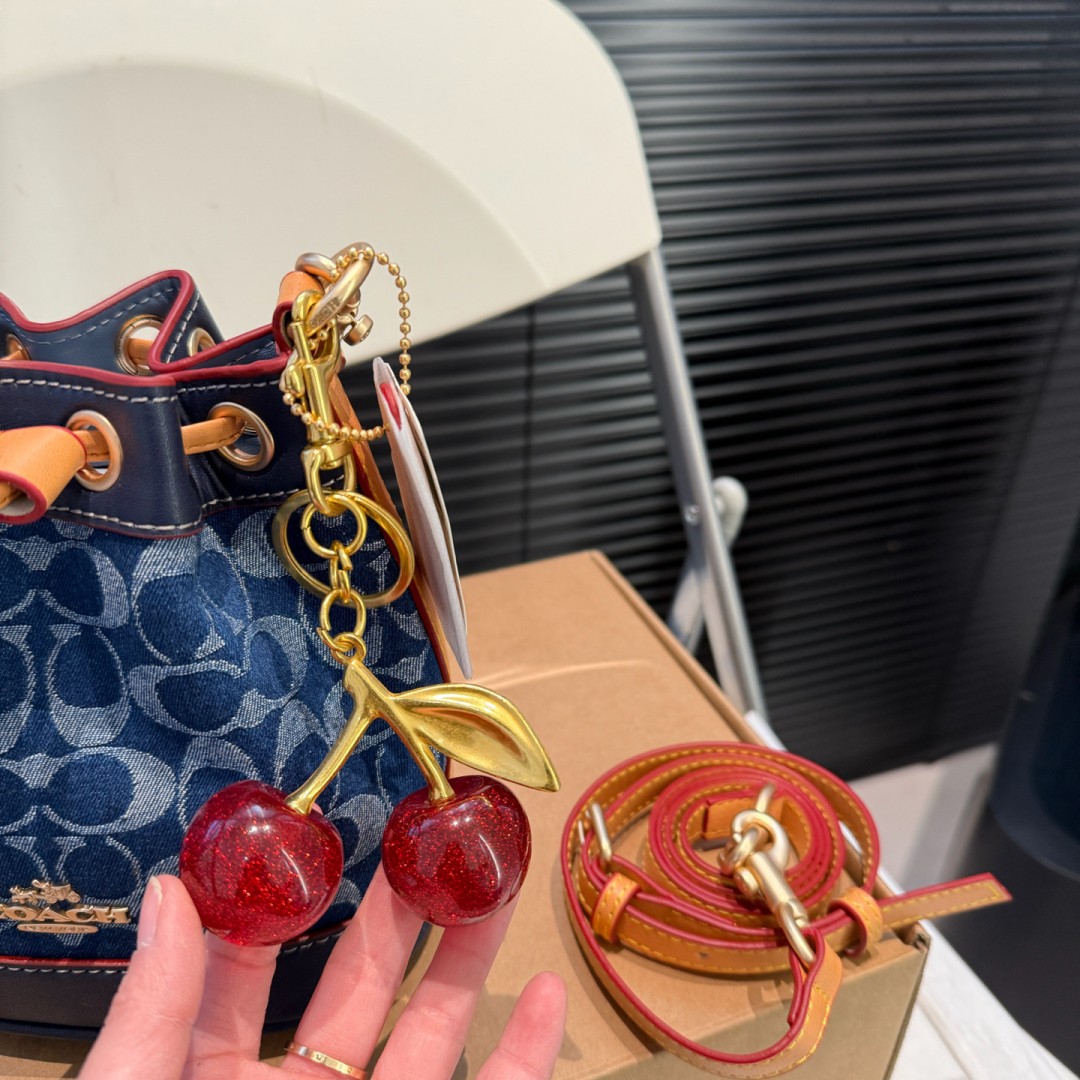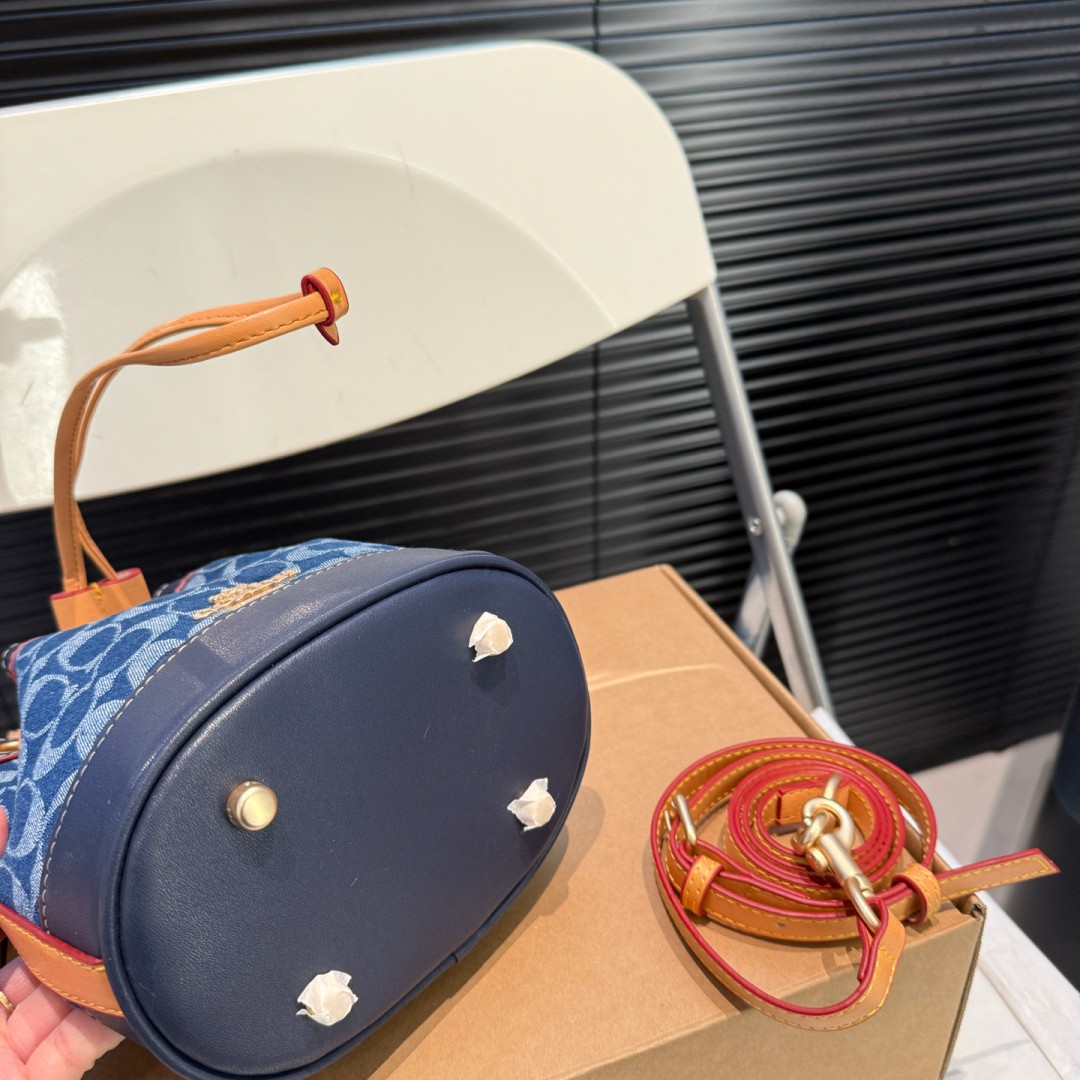 COACHのデニムバケットバッグが登場。爽やかなブルーとホワイトのブランドロゴが特徴的なデザインです。オレンジレザーのドローストリングとストラップがポップなアクセントに。楕円形のレザーベースとコーナープロテクターが耐久性を高めています。可愛いチェリーのチャームが遊び心をプラス。手提げ、ショルダー、クロスボディの3WAYで使える便利なアイテムです。