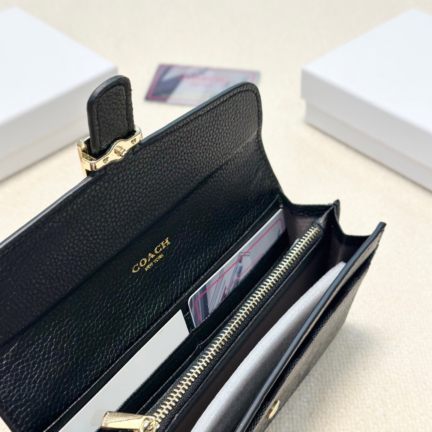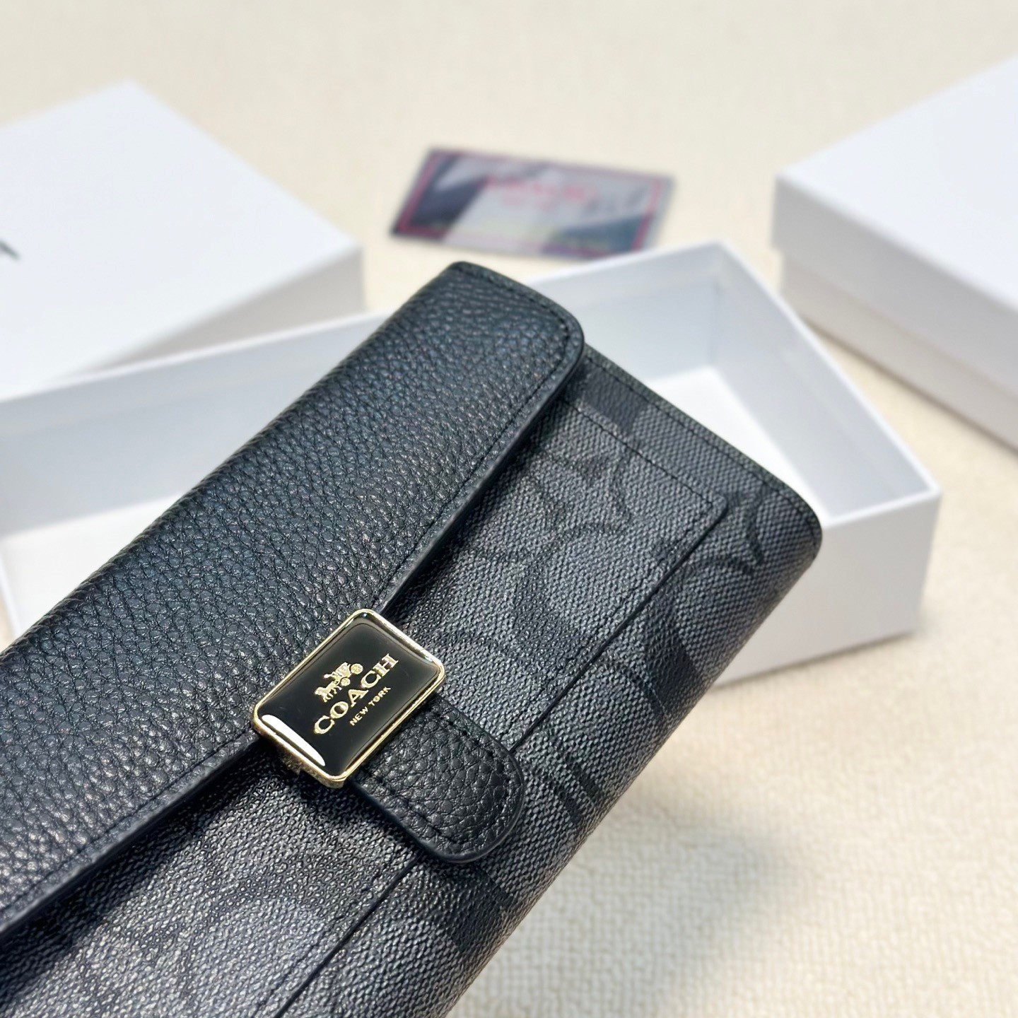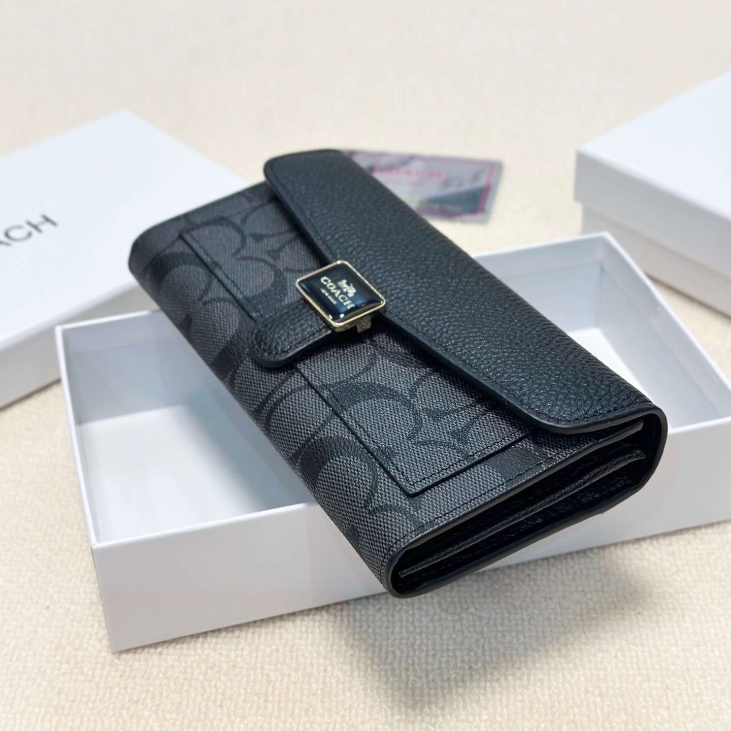 COACHのロングウォレットです。ブラックカラーのオリジナル牛革とPVC素材を使用し、ブランドの象徴的なパターンがエンボス加工されています。前面にはフラップデザインが施され、ゴールドトーンのスクエアバックルに「COACH」のロゴが刻印されています。19x10cmのコンパクトサイズで、使い勝手の良い内部構造が特徴です。シンプルながらも高級感のあるデザインで、日常使いから特別なシーンまで幅広くお使いいただけます。