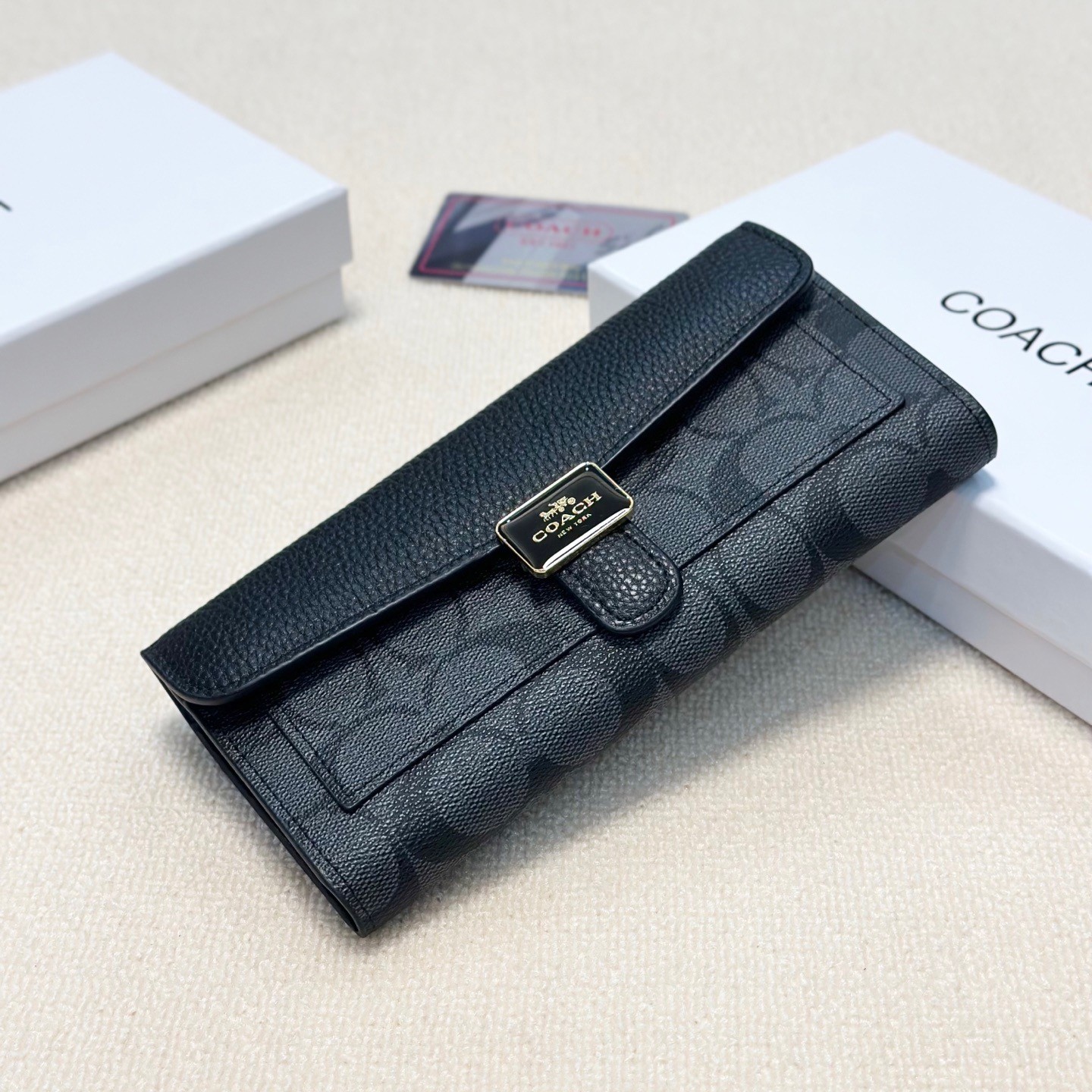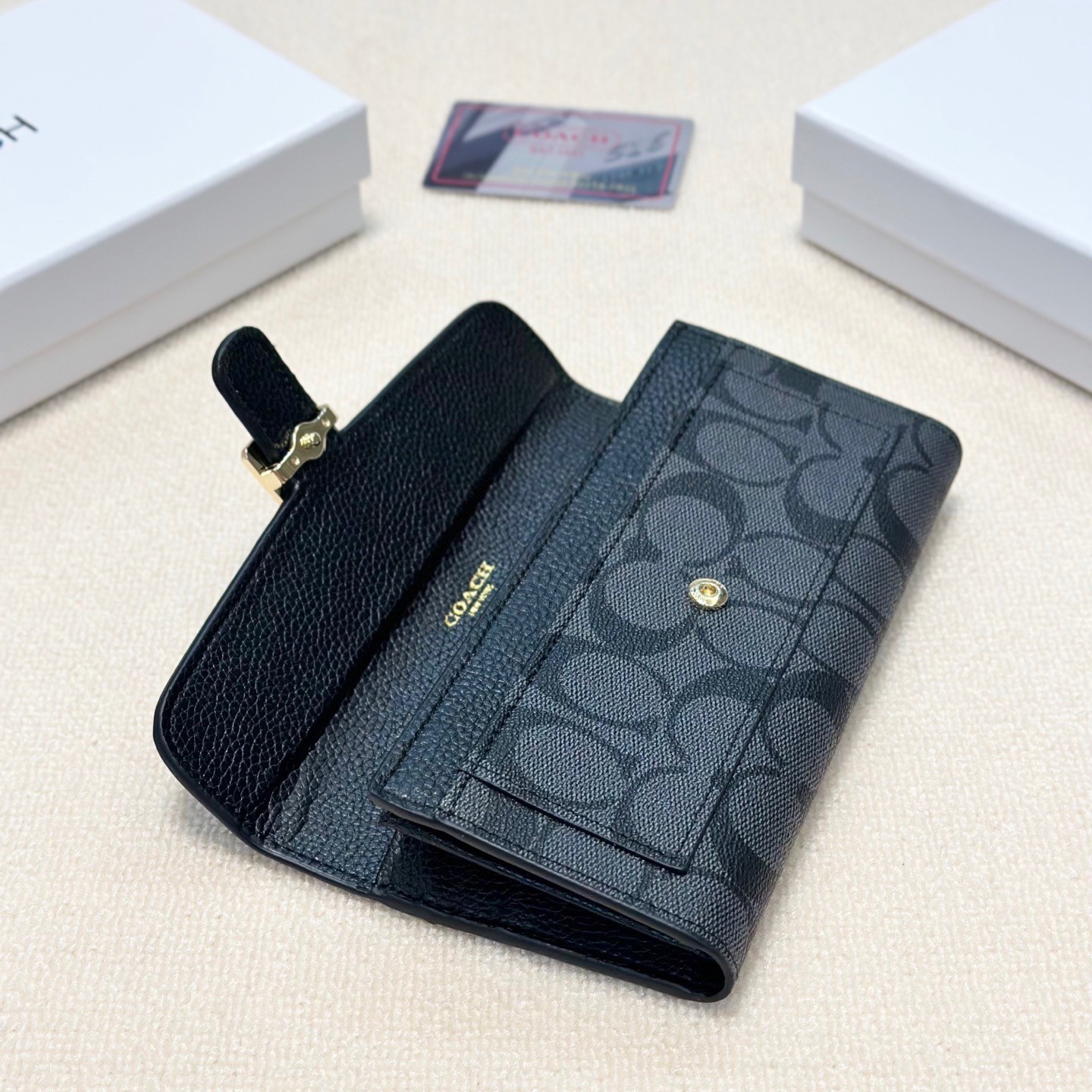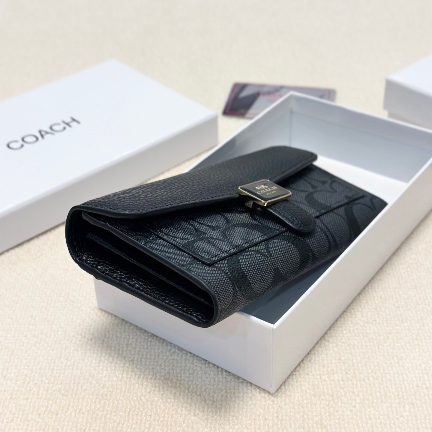 COACHのロングウォレットです。ブラックカラーのオリジナル牛革とPVC素材を使用し、ブランドの象徴的なパターンがエンボス加工されています。前面にはフラップデザインが施され、ゴールドトーンのスクエアバックルに「COACH」のロゴが刻印されています。19x10cmのコンパクトサイズで、使い勝手の良い内部構造が特徴です。シンプルながらも高級感のあるデザインで、日常使いから特別なシーンまで幅広くお使いいただけます。